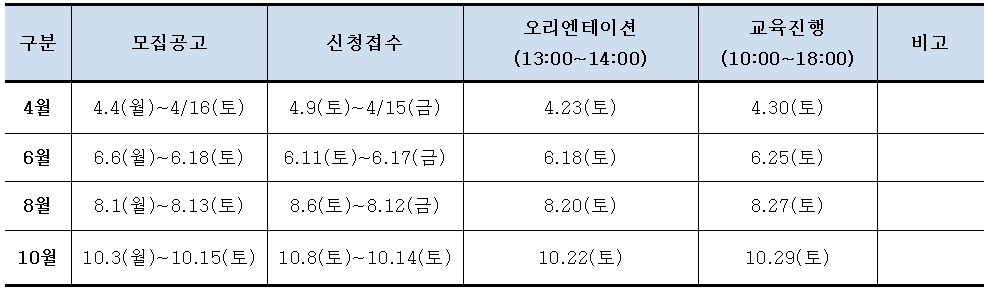 - 무단불참(노쇼,No-show) 이 3회 누적되면 향후 6개월간 교육신청 불가합니다. 신청 후 필히 참석하여 주시기 바라며, 오리엔테이션 불참시 본 수업에 참석 불가합니다. 일정 확인 후 신청해 주시기 바랍니다.