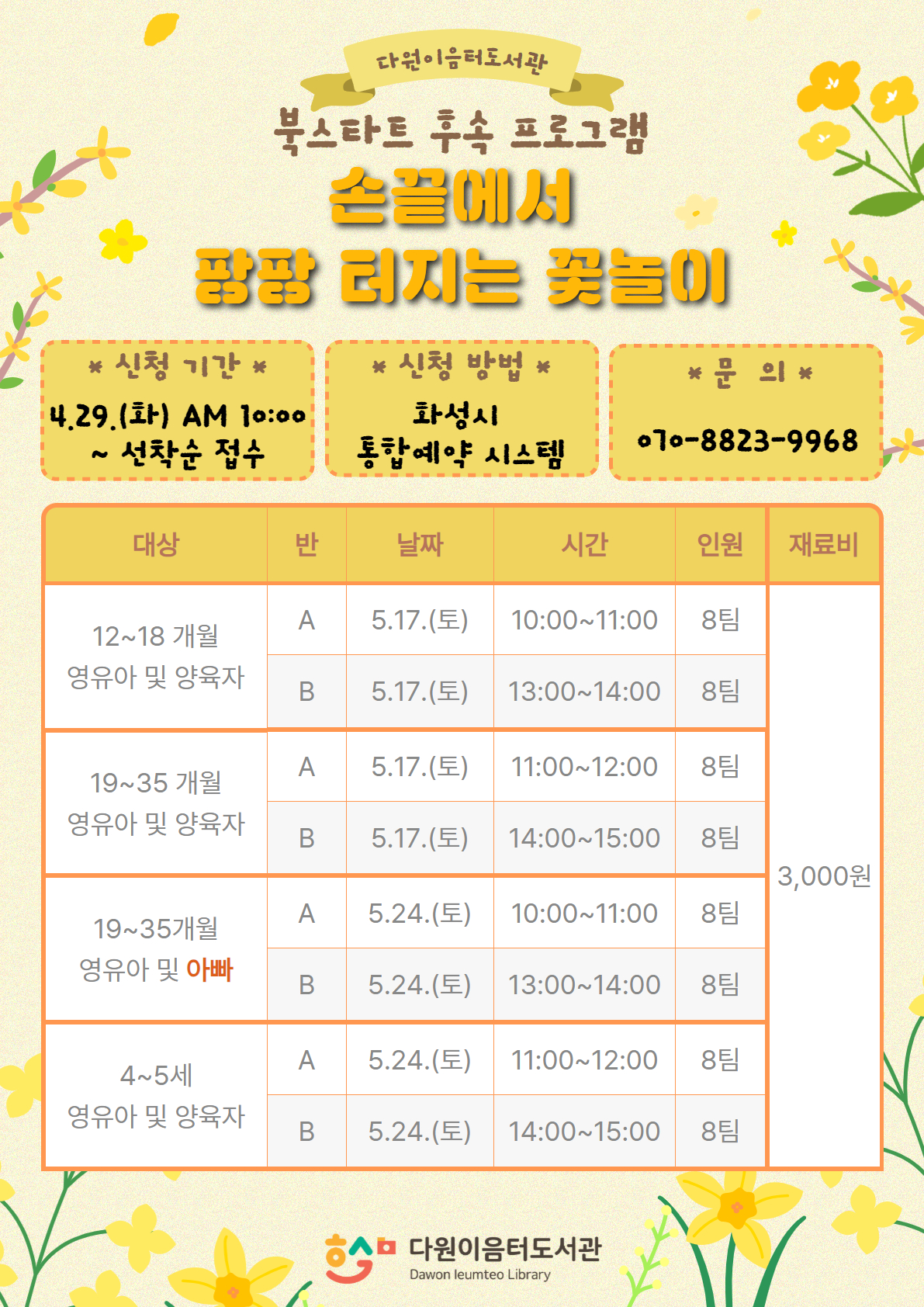 [다원이음터도서관] 북스타트 후속 프로그램 - <손 끝에서 팡팡 피어나는 꽃놀이(19~35개월 A반)>