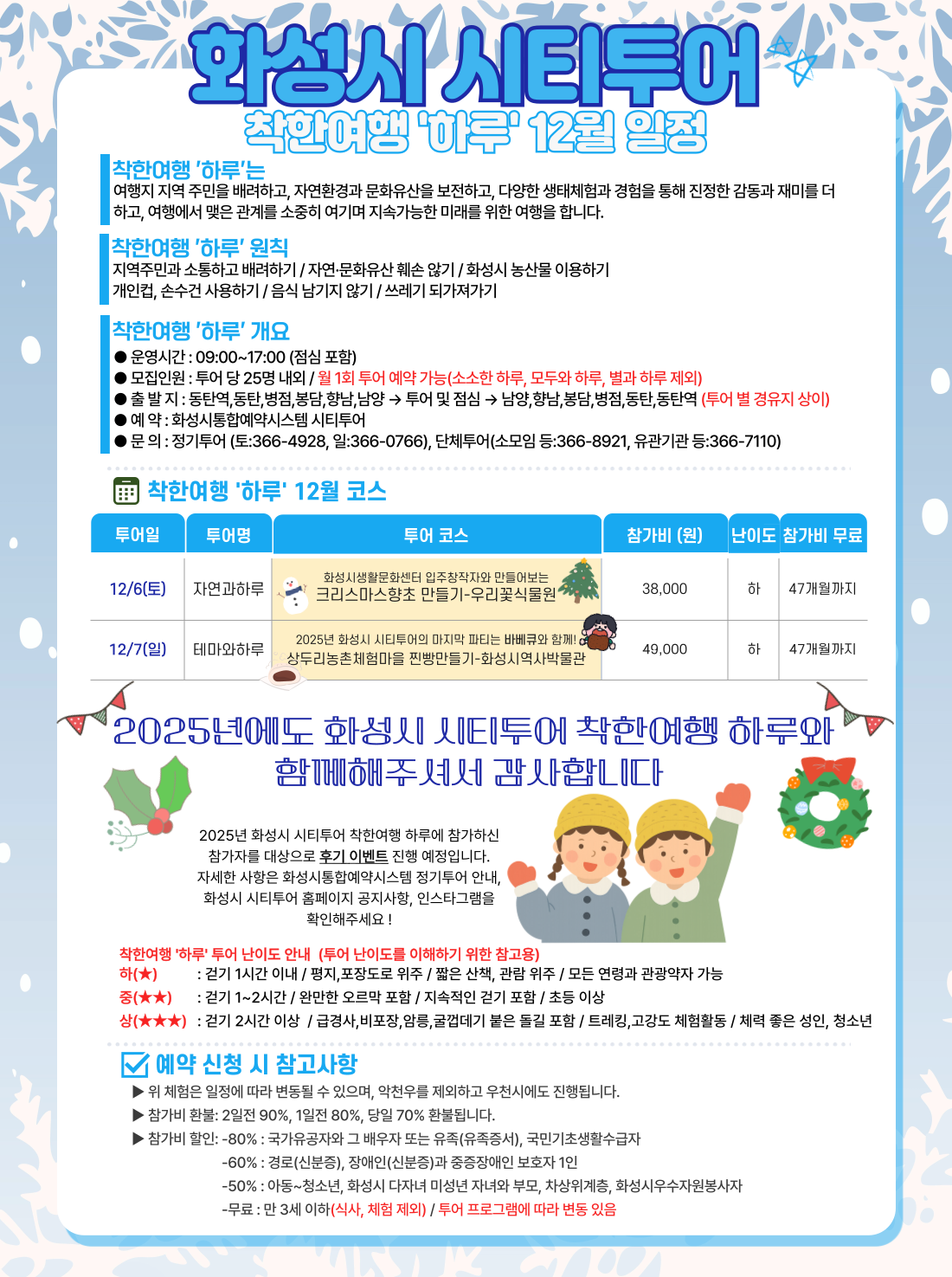 지속가능한 사회를 만들기 위한 저탄소 여행이며, 충효예향의 도시 화성의 역사와 문화를 널리 홍보하고, 탄소발생을 최소화하기 위해 일회용품 사용자제, 개인컵/손수건 지참, 1시간이상 걷기 등을 하며, 지역의 농어촌 체험을 통해 도시와 농어촌이 교류하고 전통시장, 로컬푸드 직매장 방문으로 지역경제 활성화에 기여하며, 사람과 자연, 사람과 사람이 소통하는 여행입니다. 그리고 참가비의 1%를 기부하는 착한여행입니다.