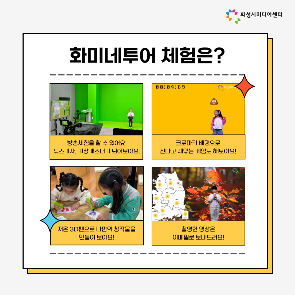 ■ 화미네 투어 프로그램은 3D펜체험(30분)+크로마키 방송체험(30분) 총 1시간 진행됩니다.