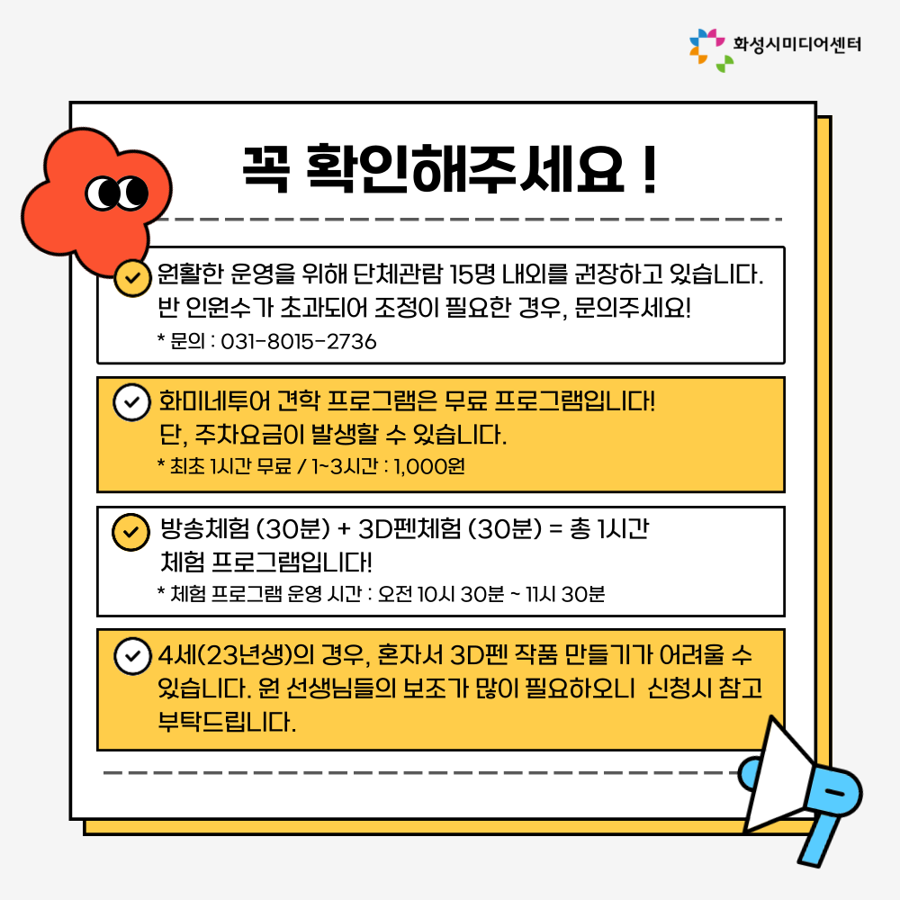 ■ 화미네 투어는 단체관람으로 진행되며, 개인적으로 프로그램 참여를 원하시는 분은 <3D펜 체험>, <키즈카메라체험>을 신청하실 수 있습니다.