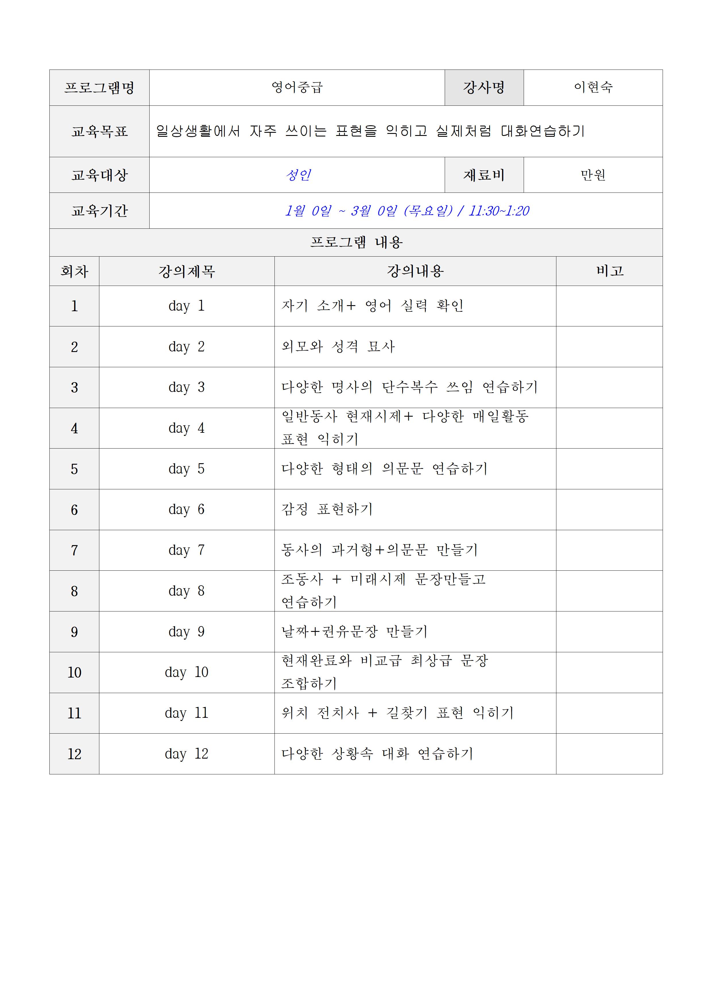 - 강사 채용에 변동사항이 있거나, 접수인원이 10명 이하(정원15명 기준) 또는 60% 이하(정원20명 이상 기준)일 경우 폐강 될 수 있습니다.