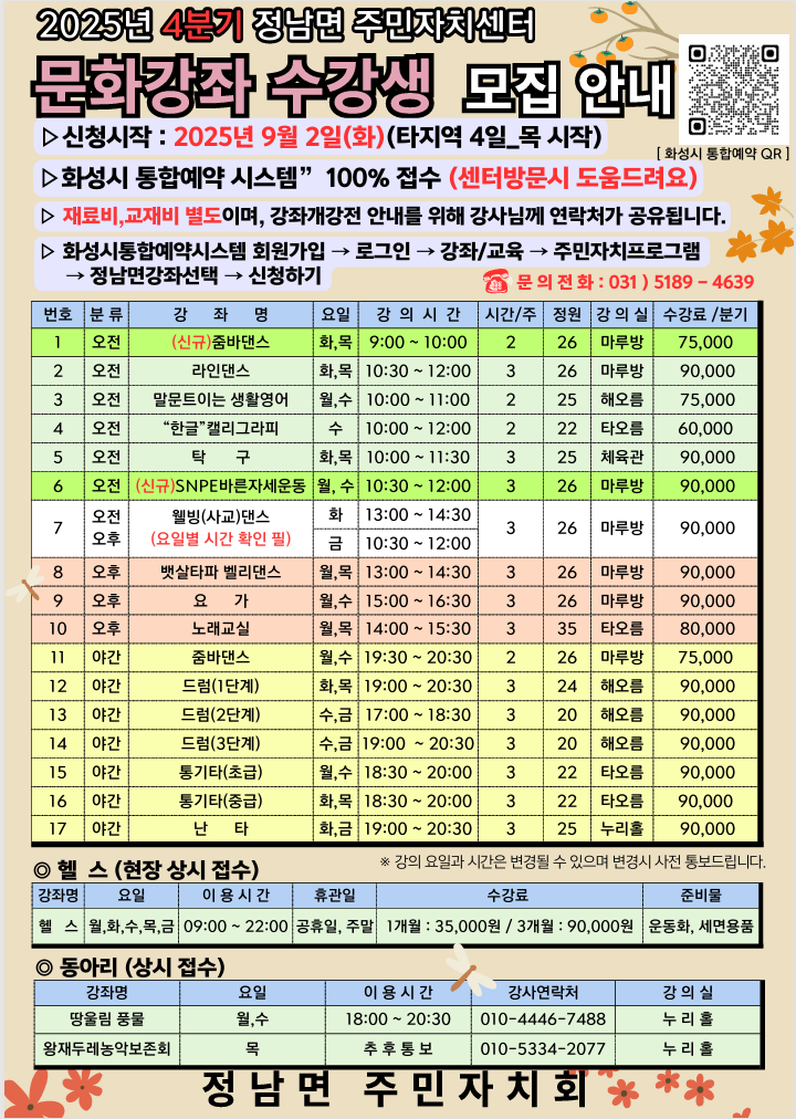- 수강료반환은 화성시 주민센터 설치및 운영조례시행규칙 규정에 의합니다.