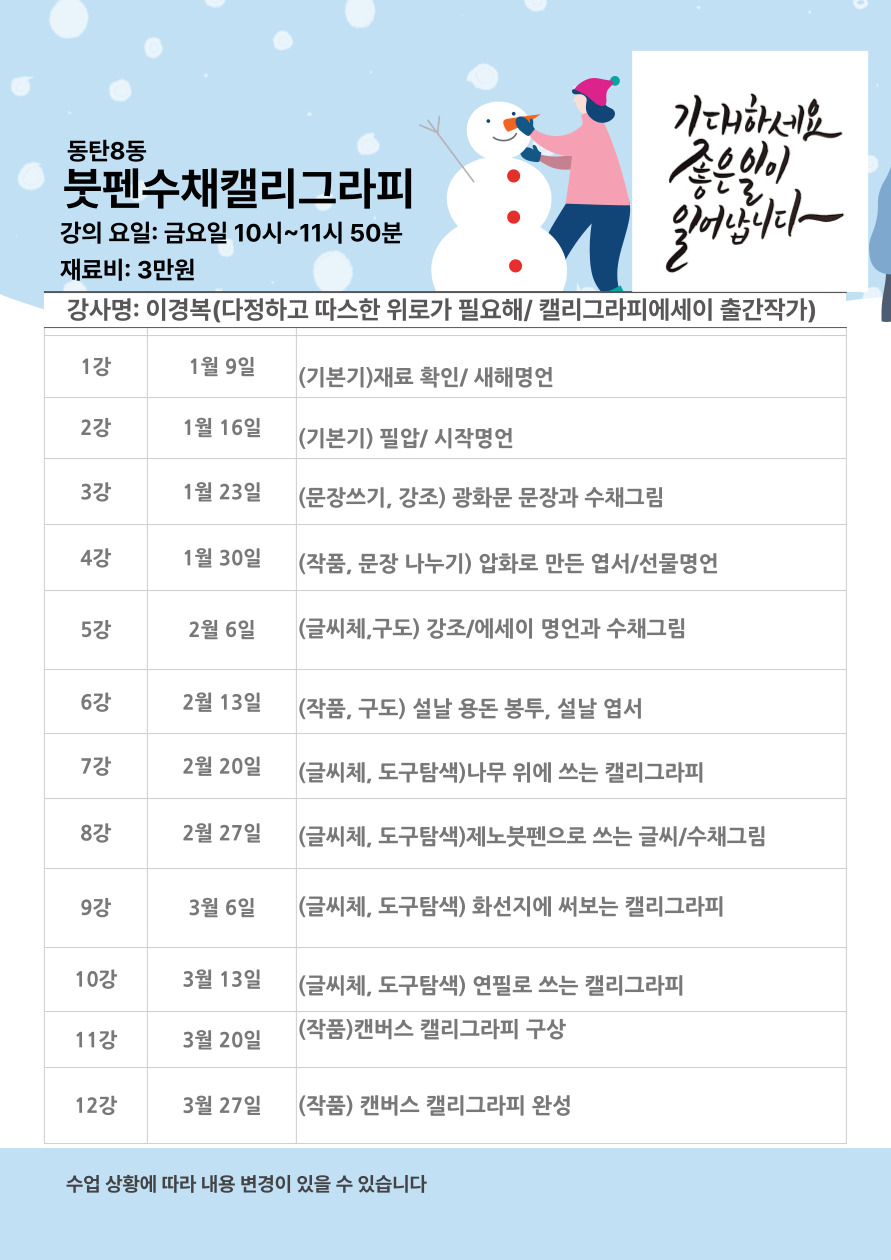 - 동 행사 등으로 강의실 사용시 휴강이 있을 수 있습니다. (추후보강)