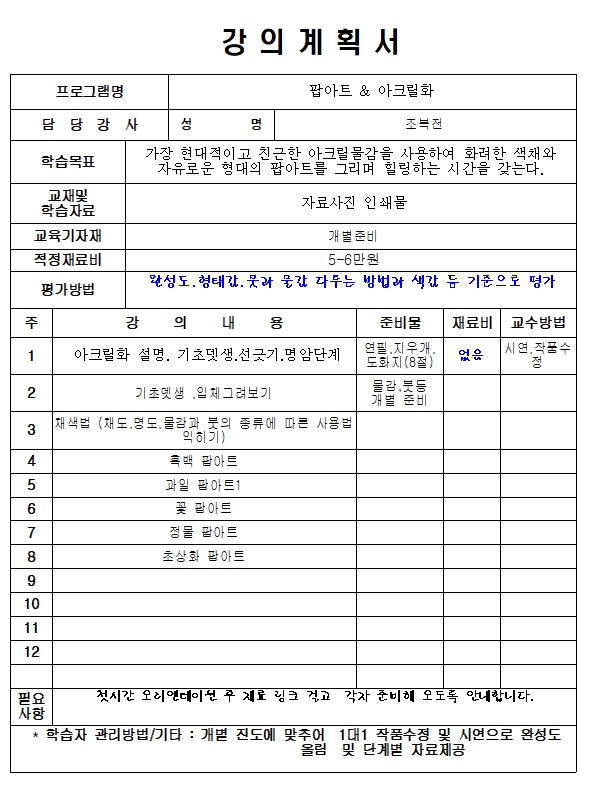 - 강좌별 재료비, 교재비는 별도이며 수강생 본인 부담입니다.
