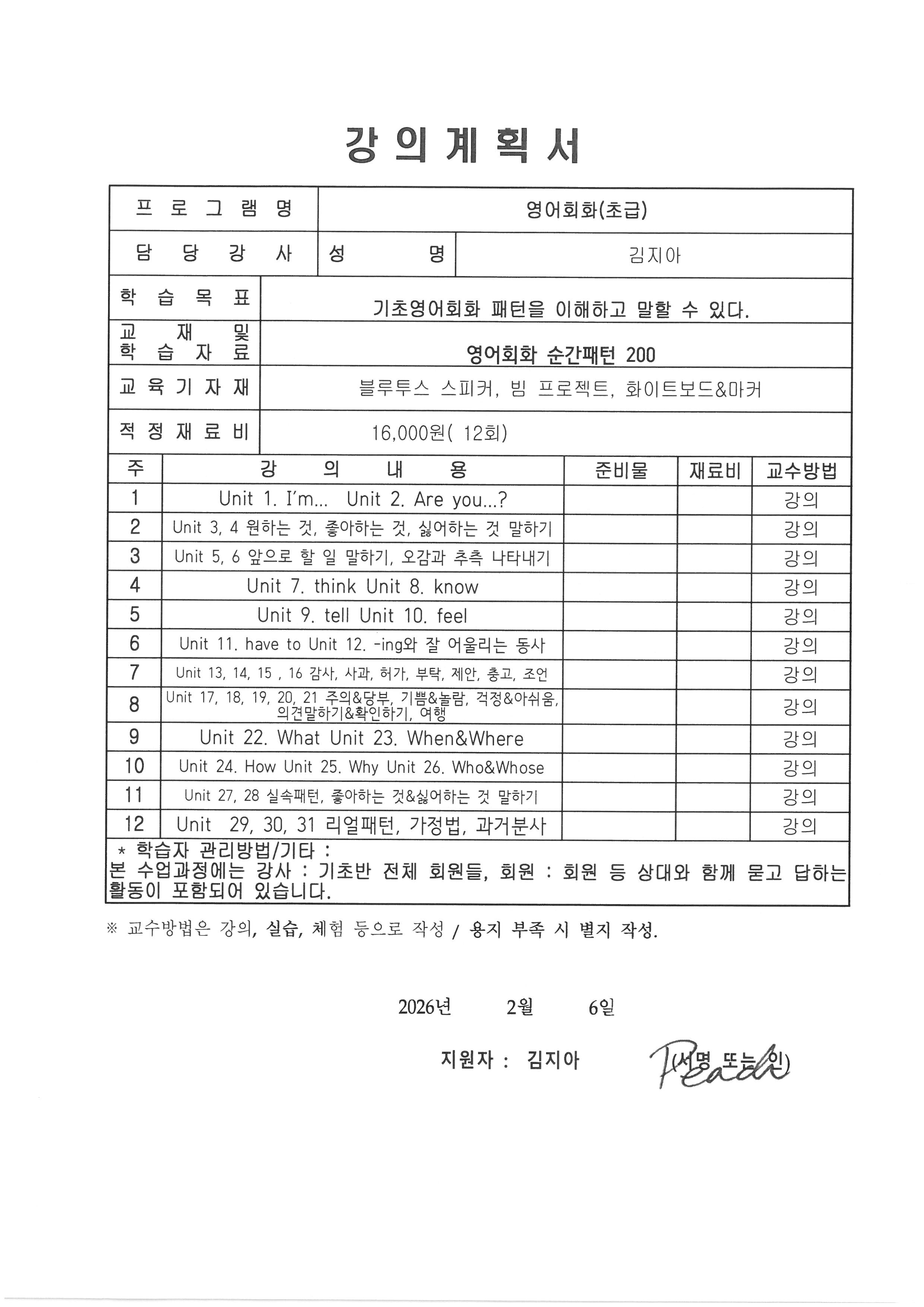 ▣ 강좌명 : 영어회화(초급) / 김지아 강사님