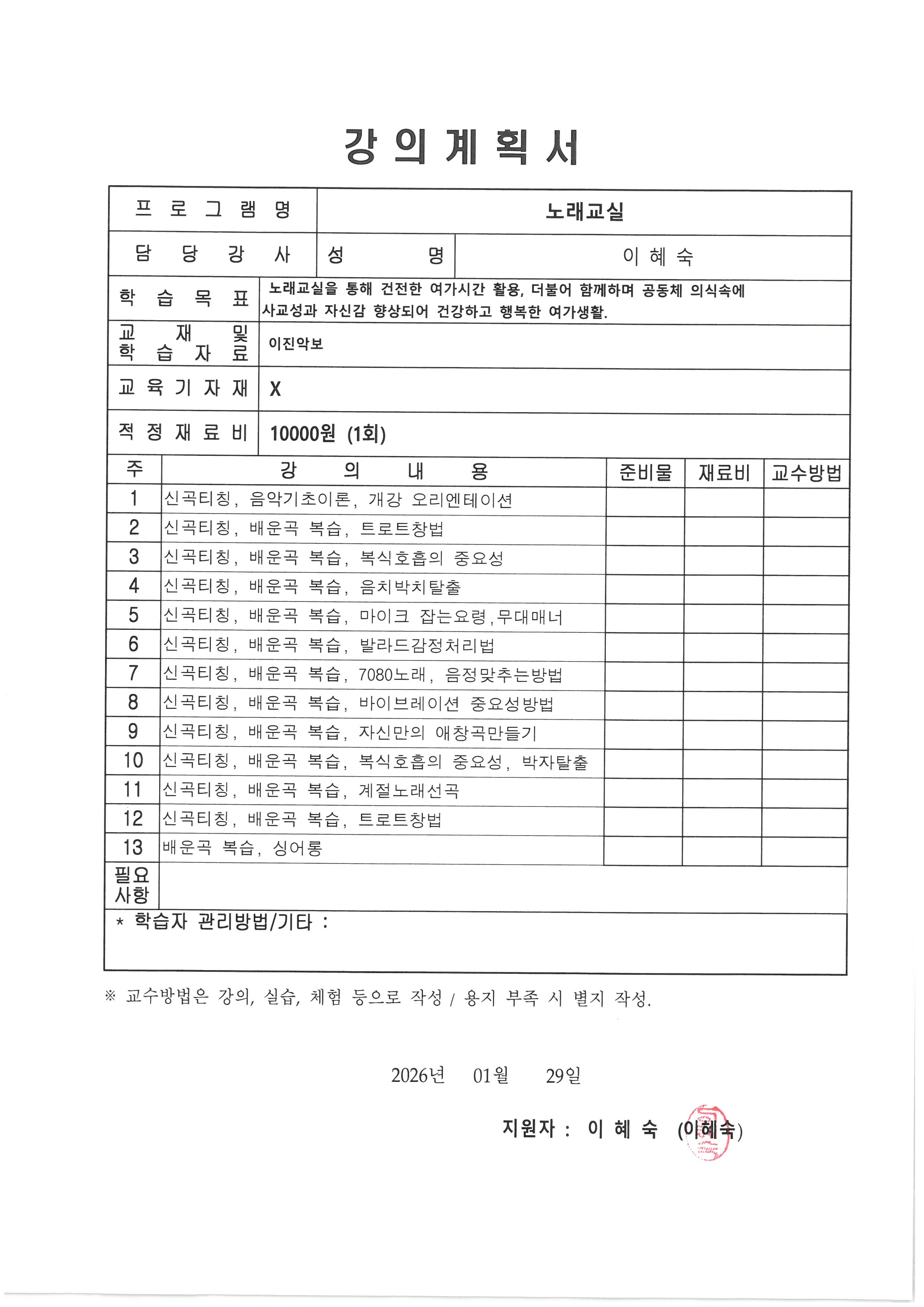 ▣ 강좌명 : 힐링노래교실 / 이하나(이혜숙) 강사님