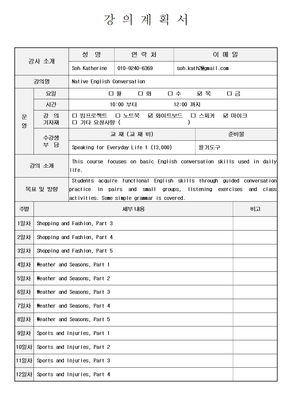 - 정규강좌의 수업일수는 법정(대체)공휴일을 포함한 12주이며 법정(대체)공휴일은 보강하지 않습니다.