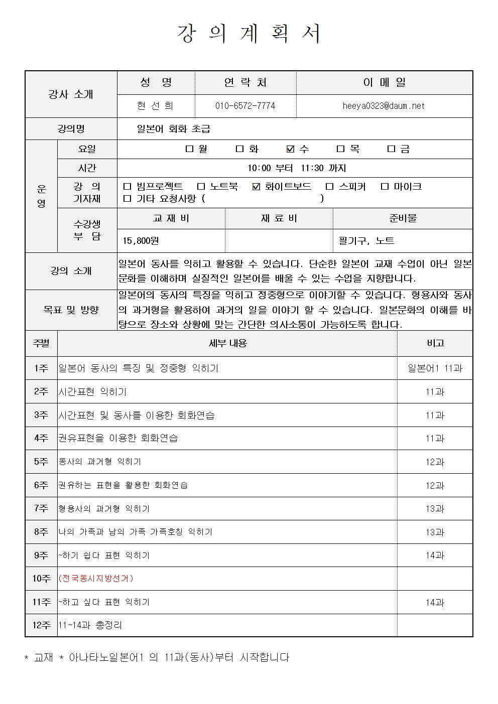 - 정규강좌의 수업일수는 법정(대체)공휴일을 포함한 12주이며 법정(대체)공휴일은 보강하지 않습니다.