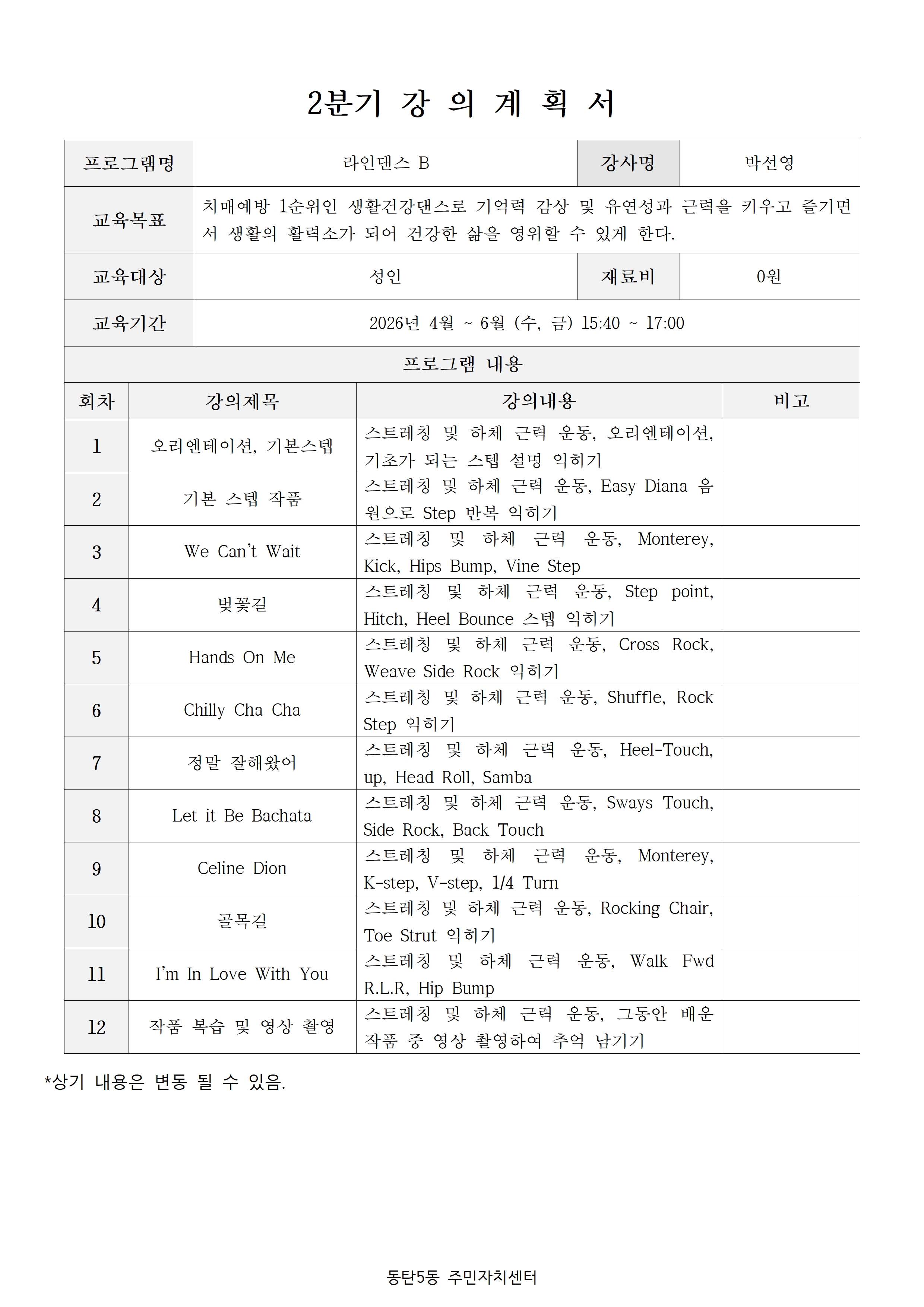 - 정원미달 강좌에 한해 분기 시작 후 한달간 추가접수가 가능합니다. (주민자치회 사무국 방문접수)