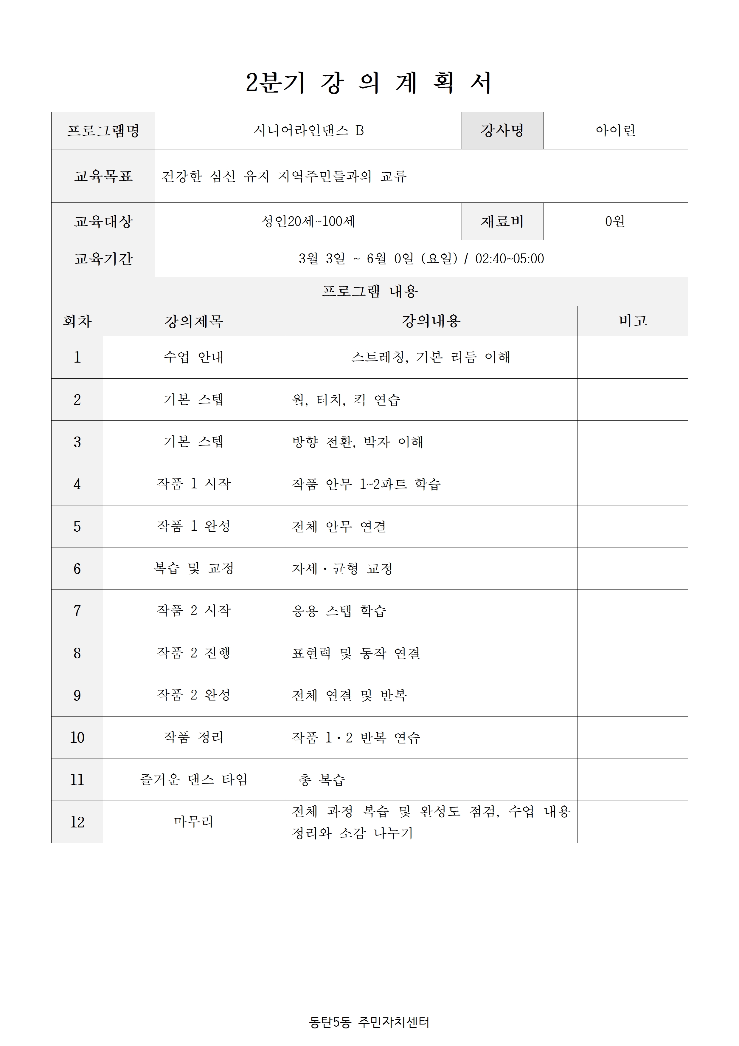 - 정원미달 강좌에 한해 분기 시작 후 한달간 추가접수가 가능합니다. (주민자치회 사무국 방문접수)