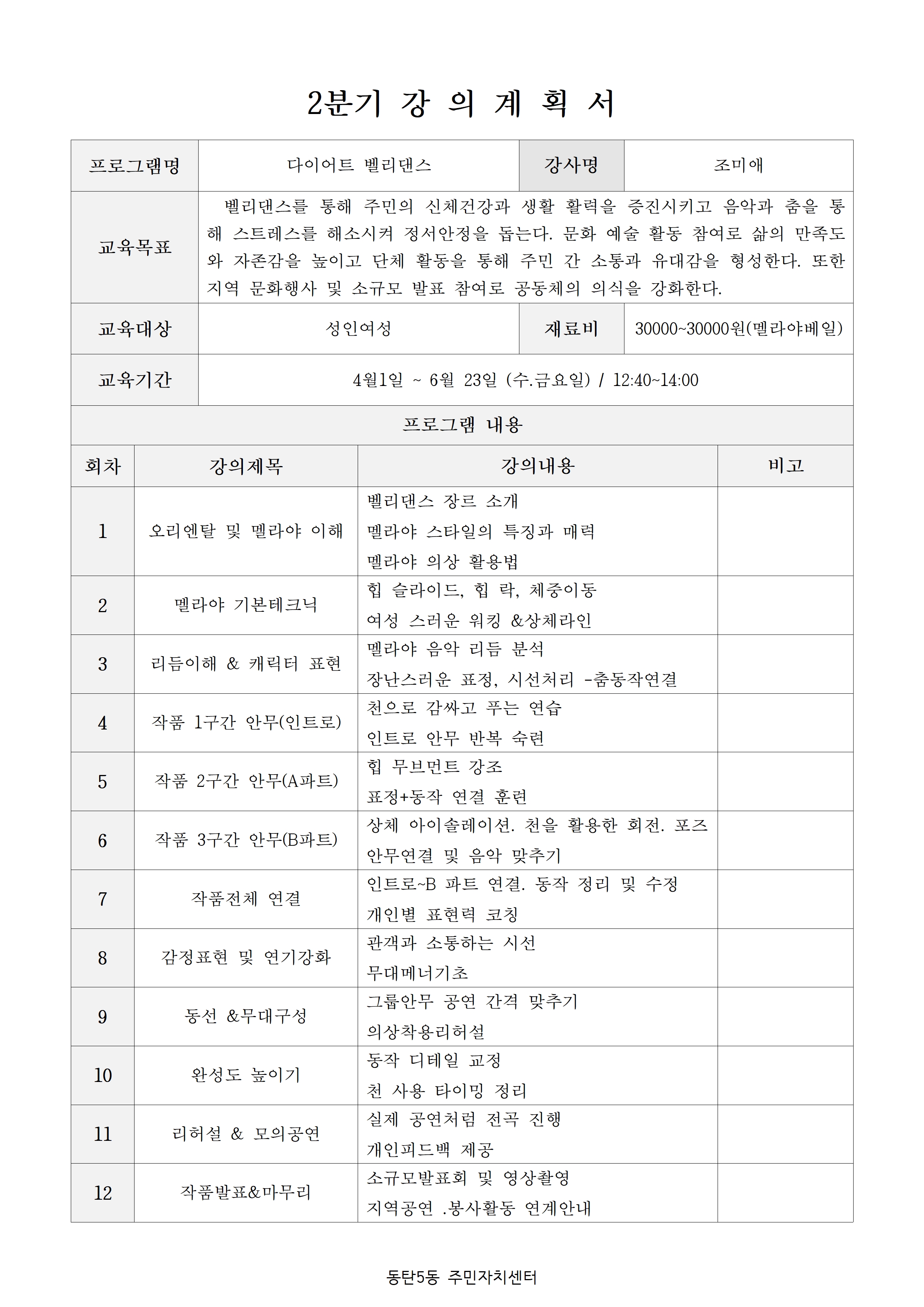- 정원미달 강좌에 한해 분기 시작 후 한달간 추가접수가 가능합니다. (주민자치회 사무국 방문접수)