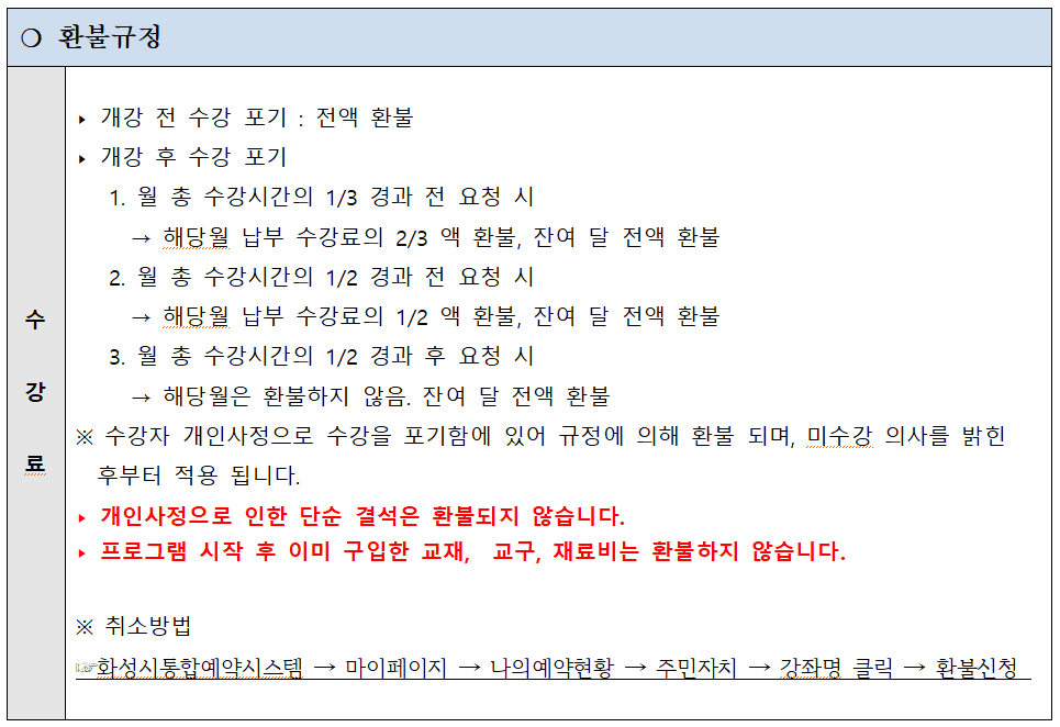 - 화성시통합예약시스템 → 마이페이지 → 나의예약현황 → 주민자치 → 강좌명 클릭 → 환불신청 가능