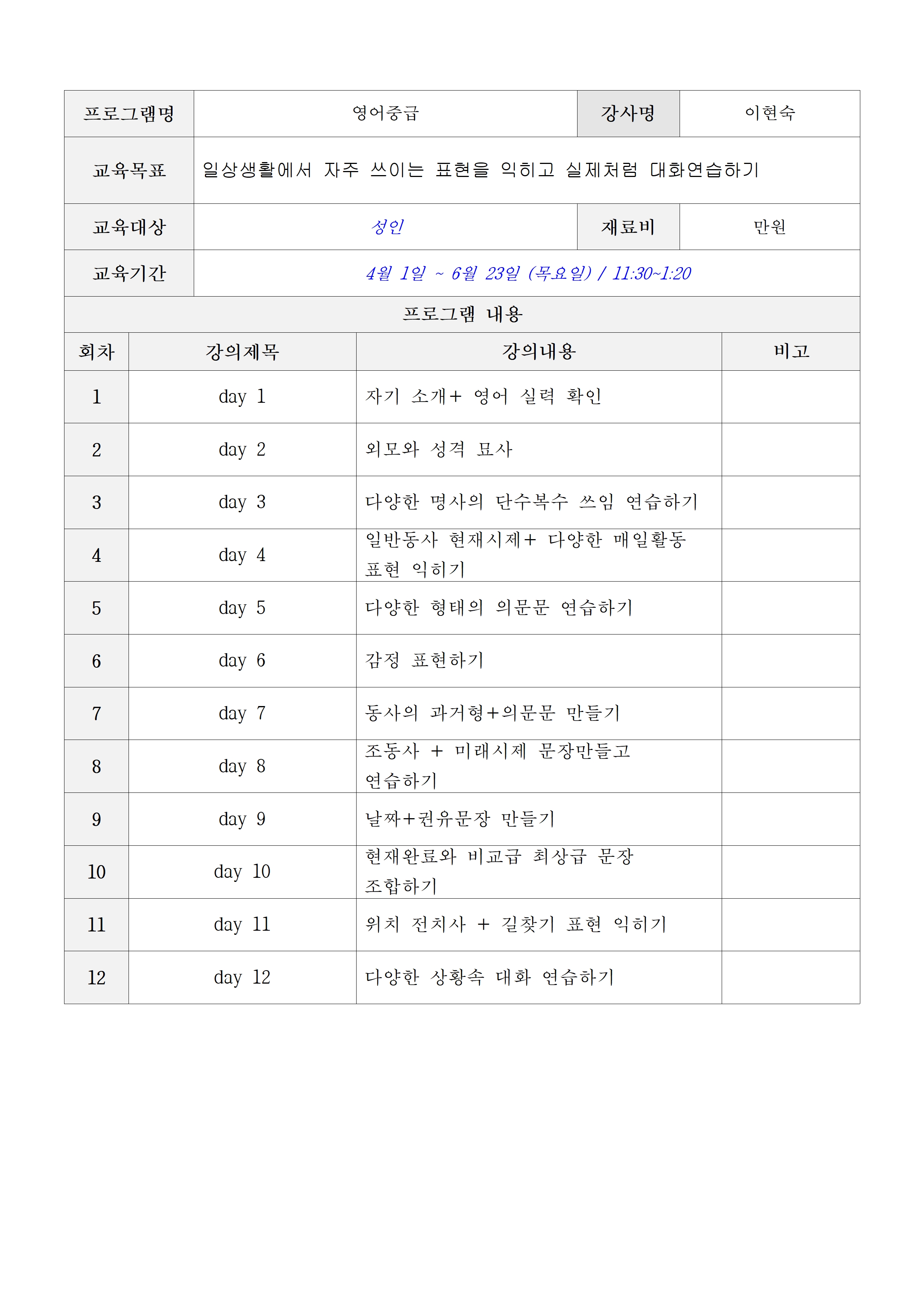 - 강사 채용에 변동사항이 있거나, 접수인원이 10명 이하(정원15명 기준) 또는 60% 이하(정원20명 이상 기준)일 경우 폐강 될 수 있습니다.