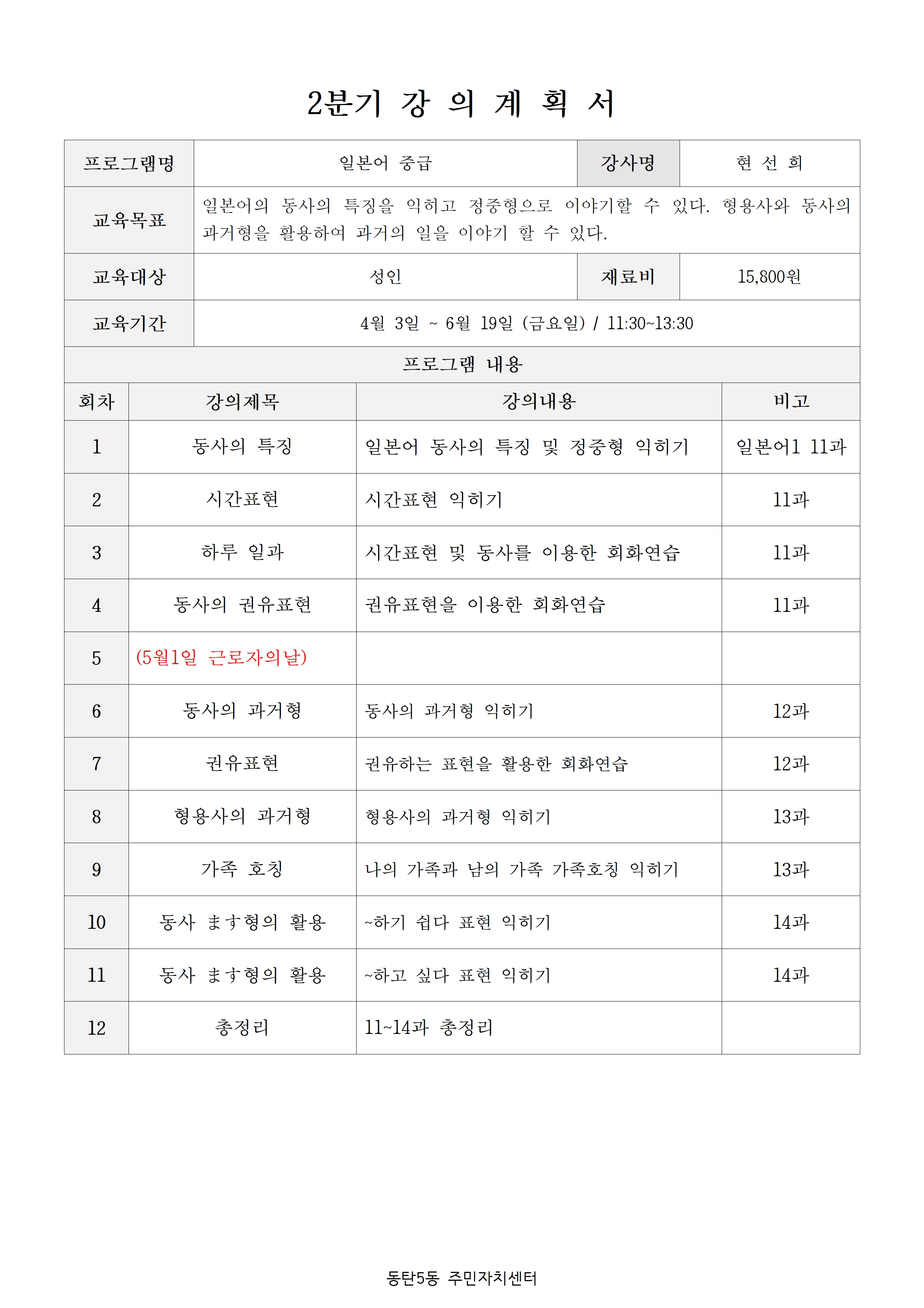 - 강사 채용에 변동사항이 있거나, 접수인원이 10명 이하(정원15명 기준) 또는 60% 이하(정원20명 이상 기준)일 경우 폐강 될 수 있습니다.