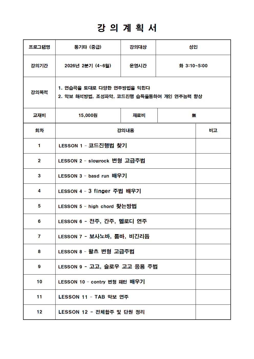 - 개인통기타, 교재비 :15,000원