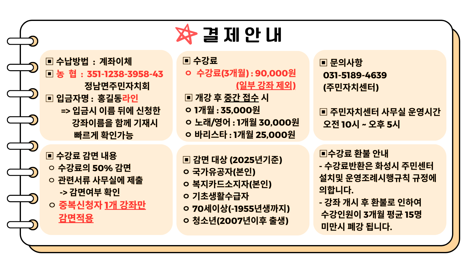 - 수강료반환은 화성시 주민센터 설치및 운영조례시행규칙 규정에 의합니다.