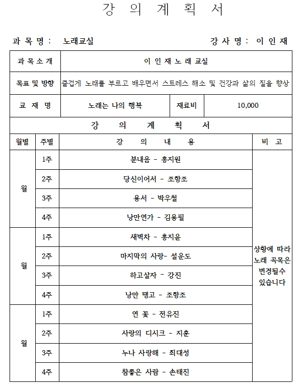 - 프로그램 운영은 강사와 센터 사정에 의해서 변경될 수 있습니다.