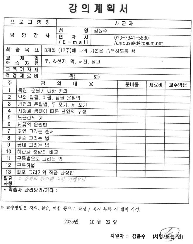 ▣ 준비물 : 붓, 먹, 화선지 등(미리 연락하면 강사님께 구매 가능)