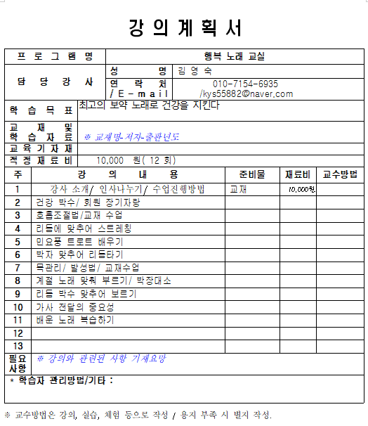 - 교재비 약 15,000원(강사에게 지급)