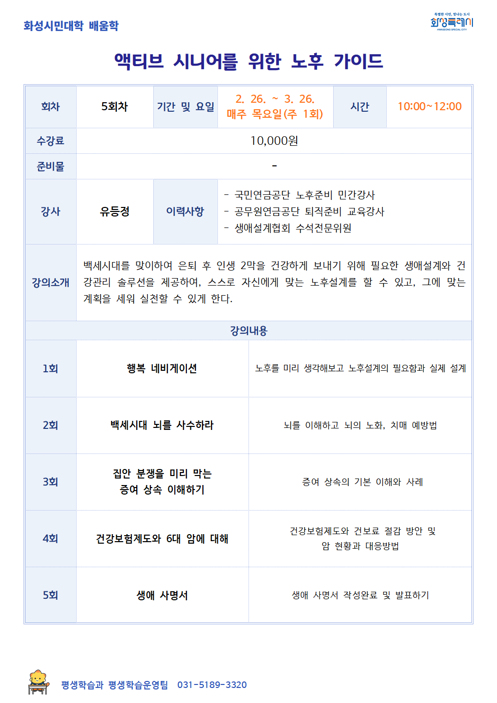 [폐강][화성시민대학] 액티브 시니어를 위한 노후 가이드(봉담)
