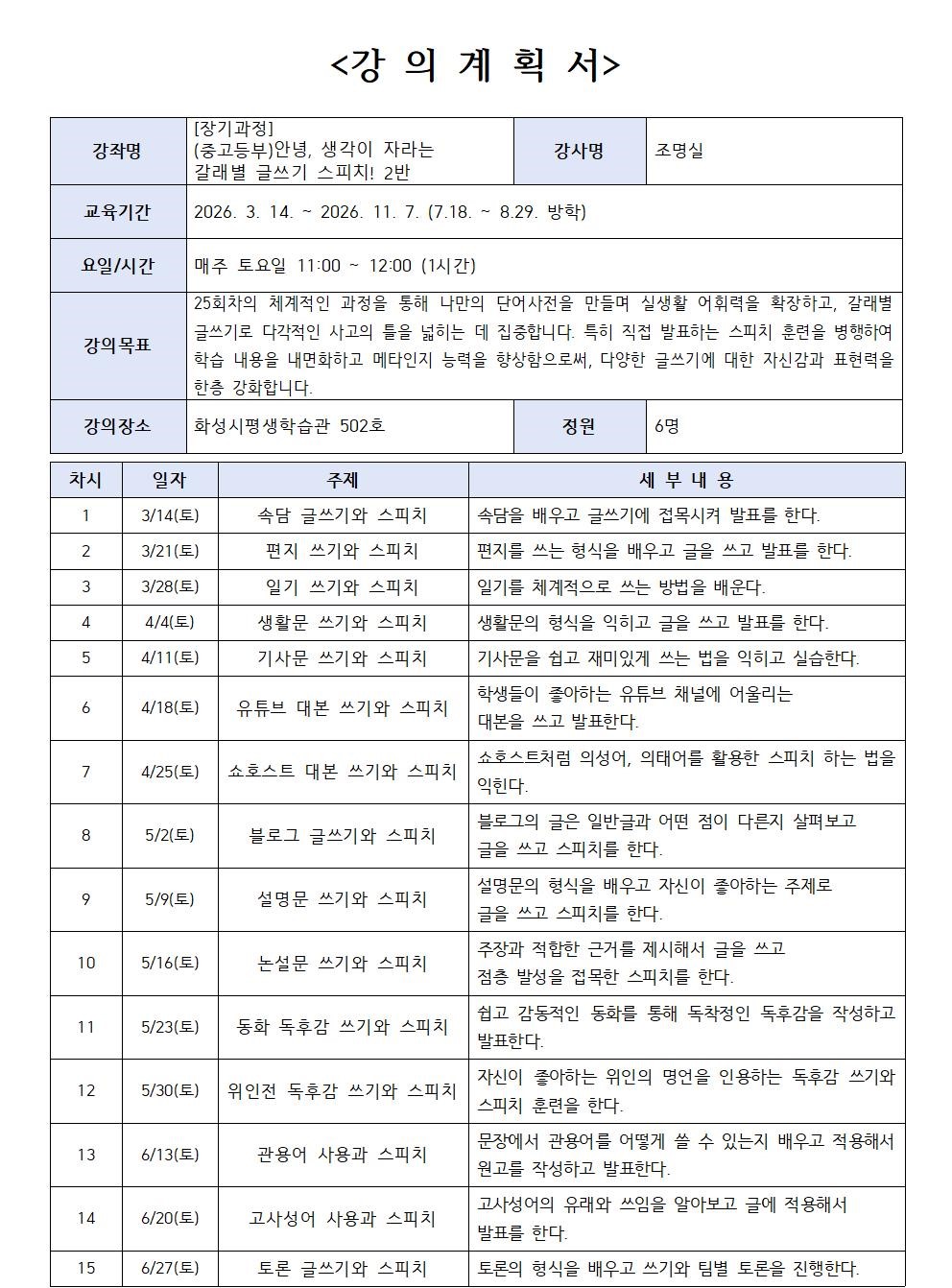[느린학습자 학습단비] [장기과정] (중고등부) 안녕, 생각이 자라는 갈래별 글쓰기 스피치! 2반 (장소: 화성시평생학습관)