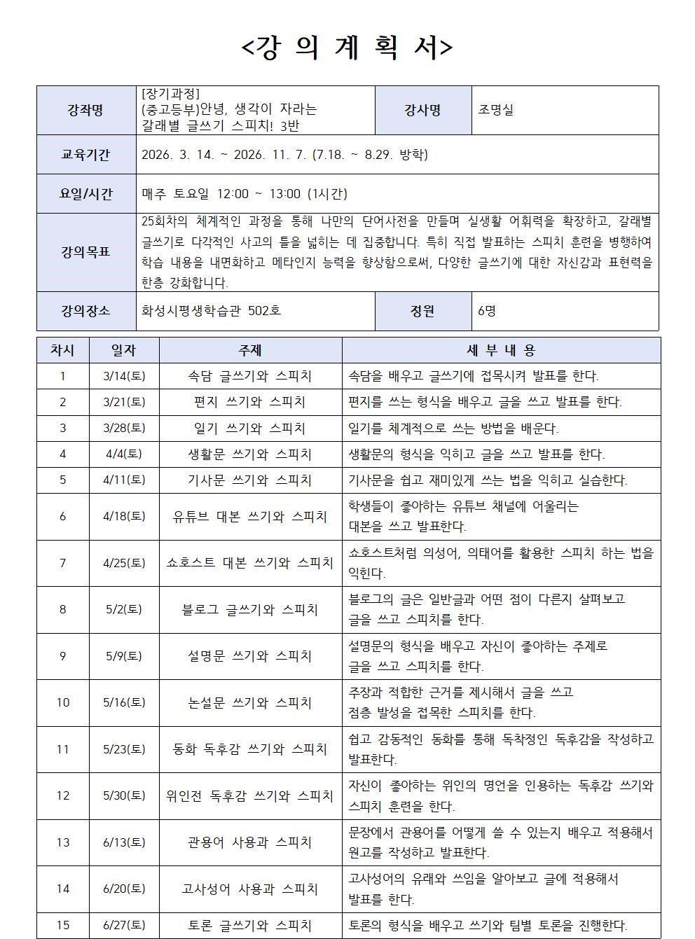 [느린학습자 학습단비] [장기과정] (중고등부) 안녕, 생각이 자라는 갈래별 글쓰기 스피치! 3반 (장소: 화성시평생학습관)