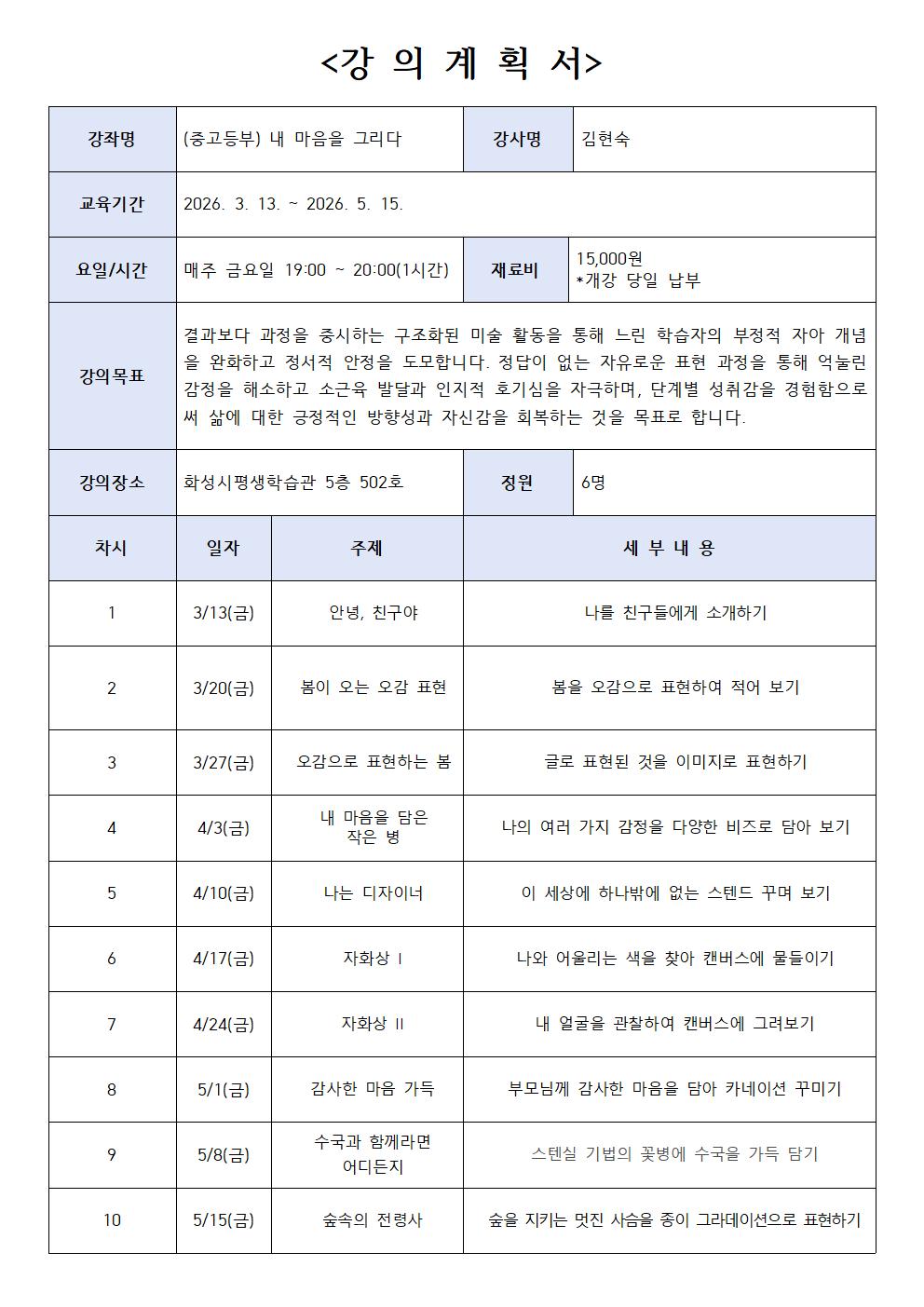 [느린학습자 학습단비] (중고등부) 내 마음을 그리다 (장소: 화성시평생학습관)
