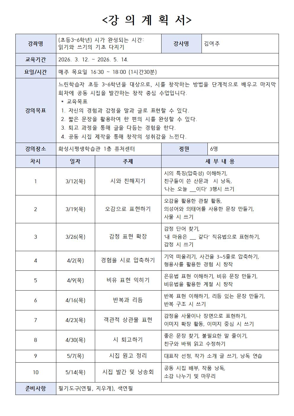 [느린학습자 학습단비] (초등3~6학년) 시가 완성되는 시간 : 읽기와 쓰기의 기초 다지기 (장소: 화성시평생학습관)