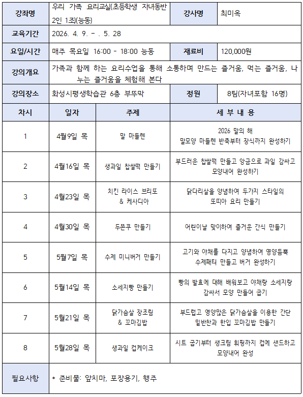 [하모니학교] 우리 가족 요리교실(초등학생 자녀동반 2인 1조)(동탄)