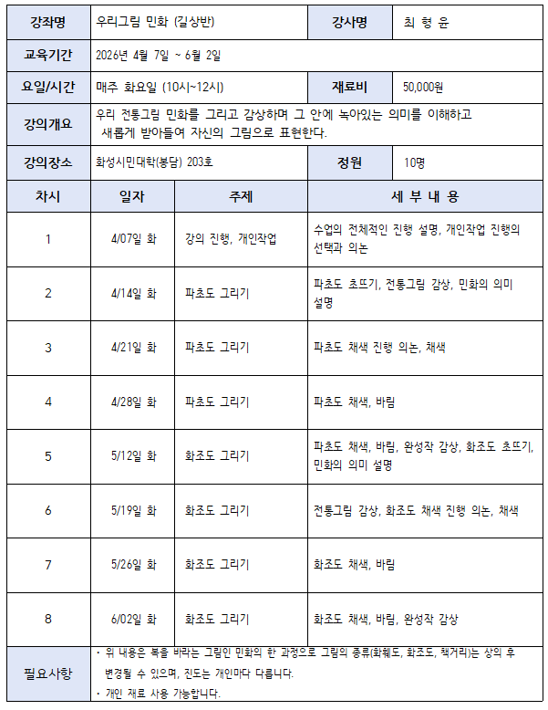- 화성시민대학(효행구 봉담읍 효행로212)