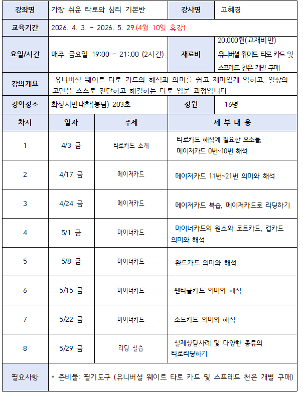 - 화성시민대학(효행구 봉담읍 효행로212)