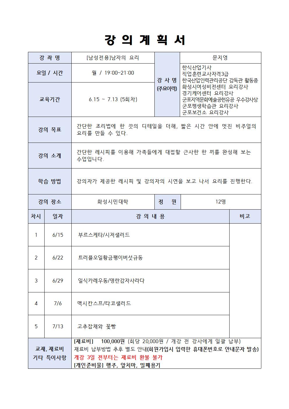 [직장인 달빛학교][남성전용] 남자의 요리(장소:봉담)
