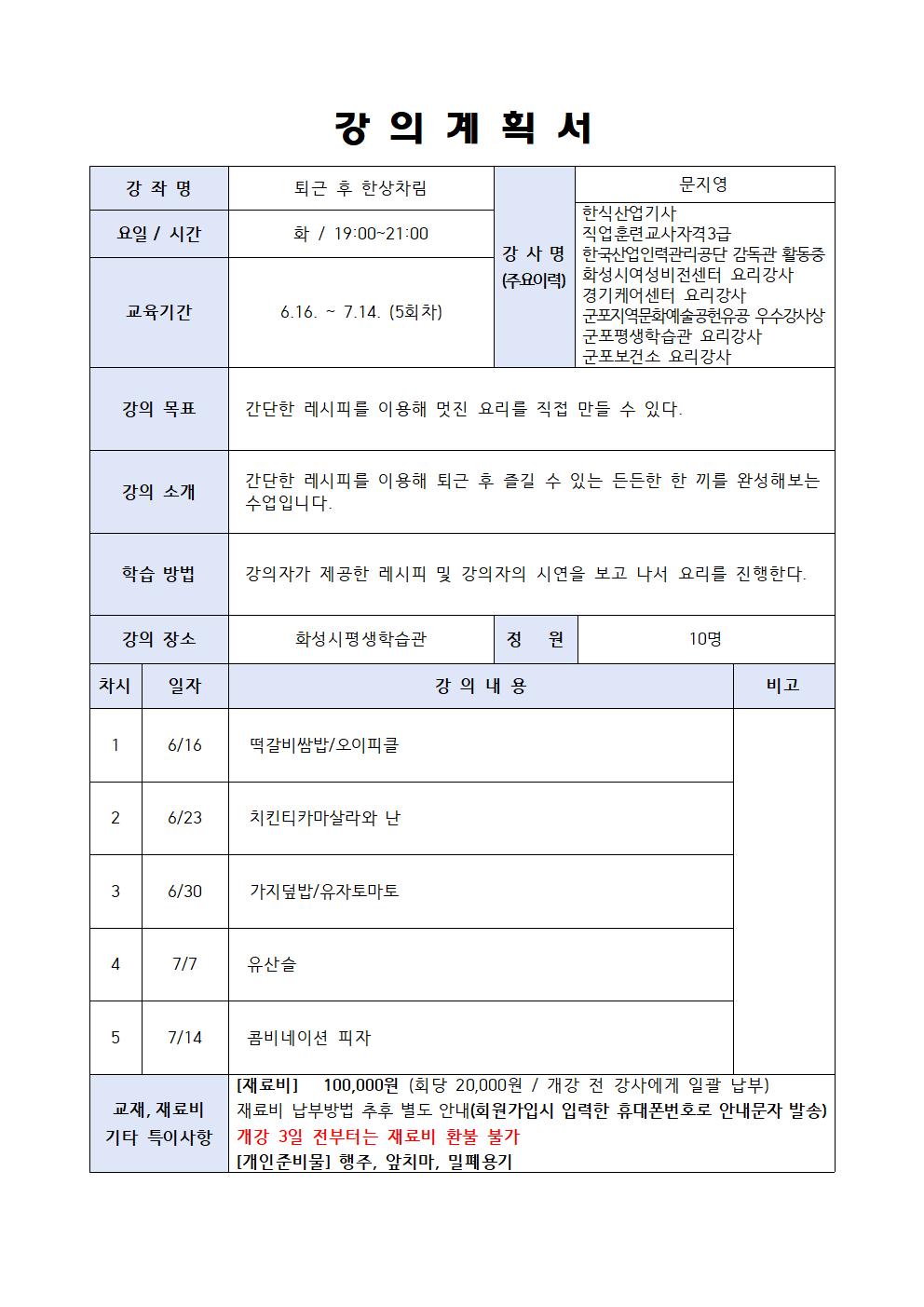 [직장인 달빛학교]퇴근 후 한상차림(장소:동탄)