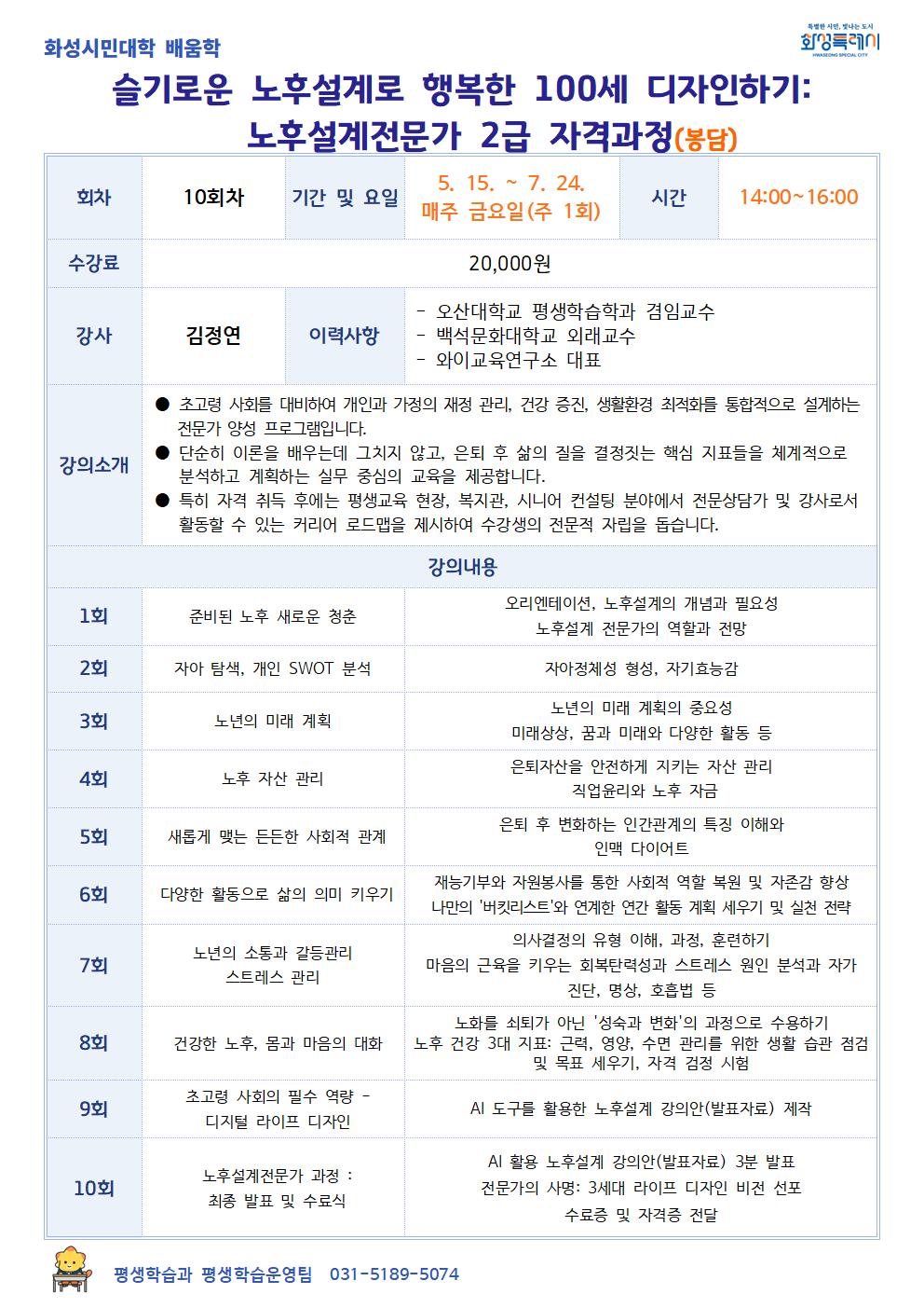[화성시민대학] 슬기로운 노후설계로 행복한 110세 디자인하기: 노후설계전문가 2급 자격과정(봉담)