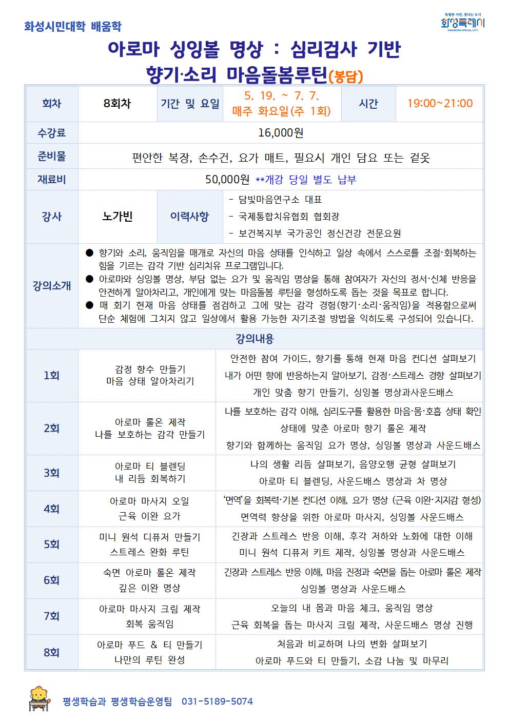 [화성시민대학] 아로마 싱잉볼 명상 : 심리검사 기반 향기·소리 마음돌봄 루틴(봉담)