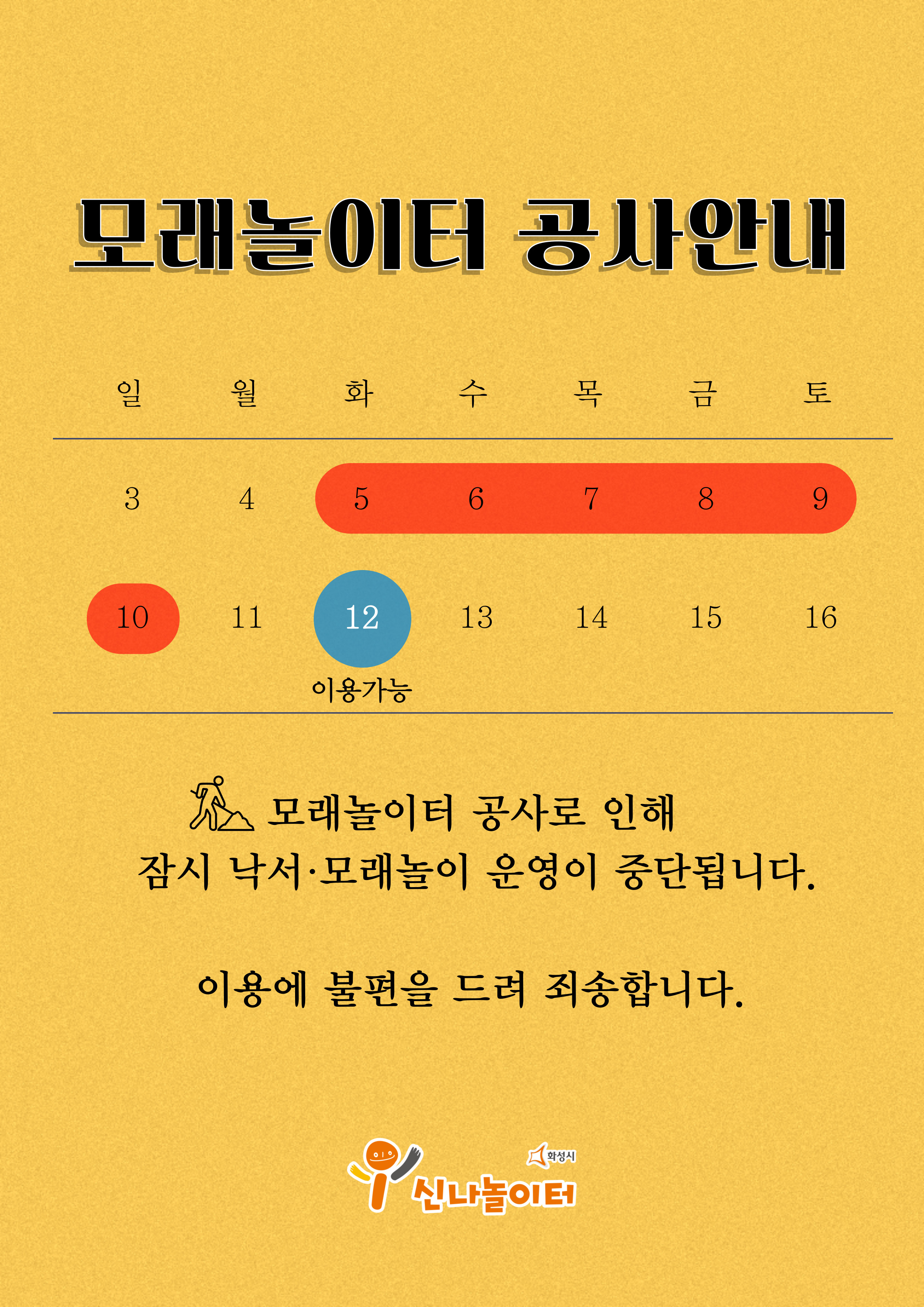 ► 11/5 (화) ~ 11/10 (일) 기간 동안 모래놀이터 보수공사로 실외놀이(모래놀이, 낙서놀이) 이용이 제한됩니다.
