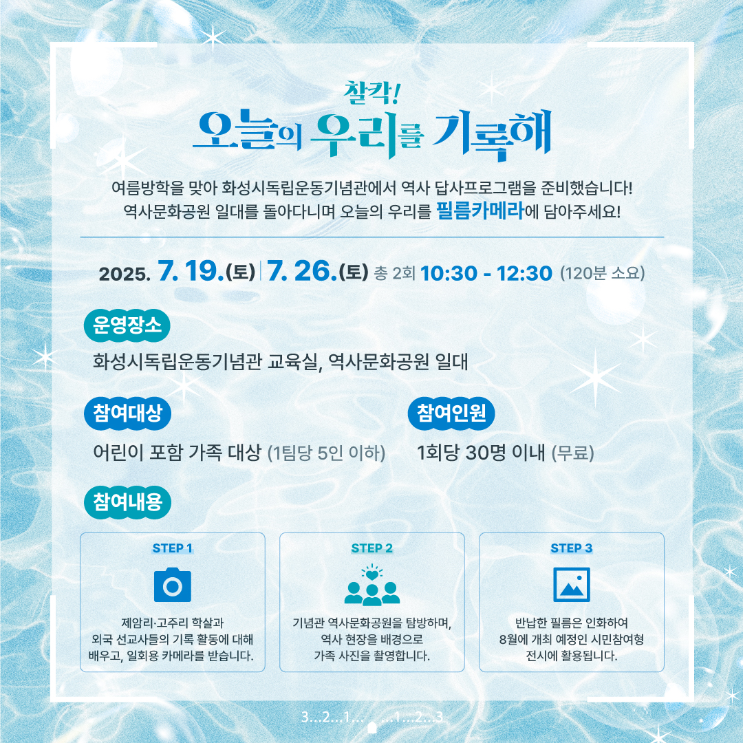 - 프로그램 운영 중 직원의 사진 촬영이 이뤄질 수 있으며, 기념관 홍보 채널 및 결과물 제작에 사용될 수 있습니다.(비상업적 용도)
