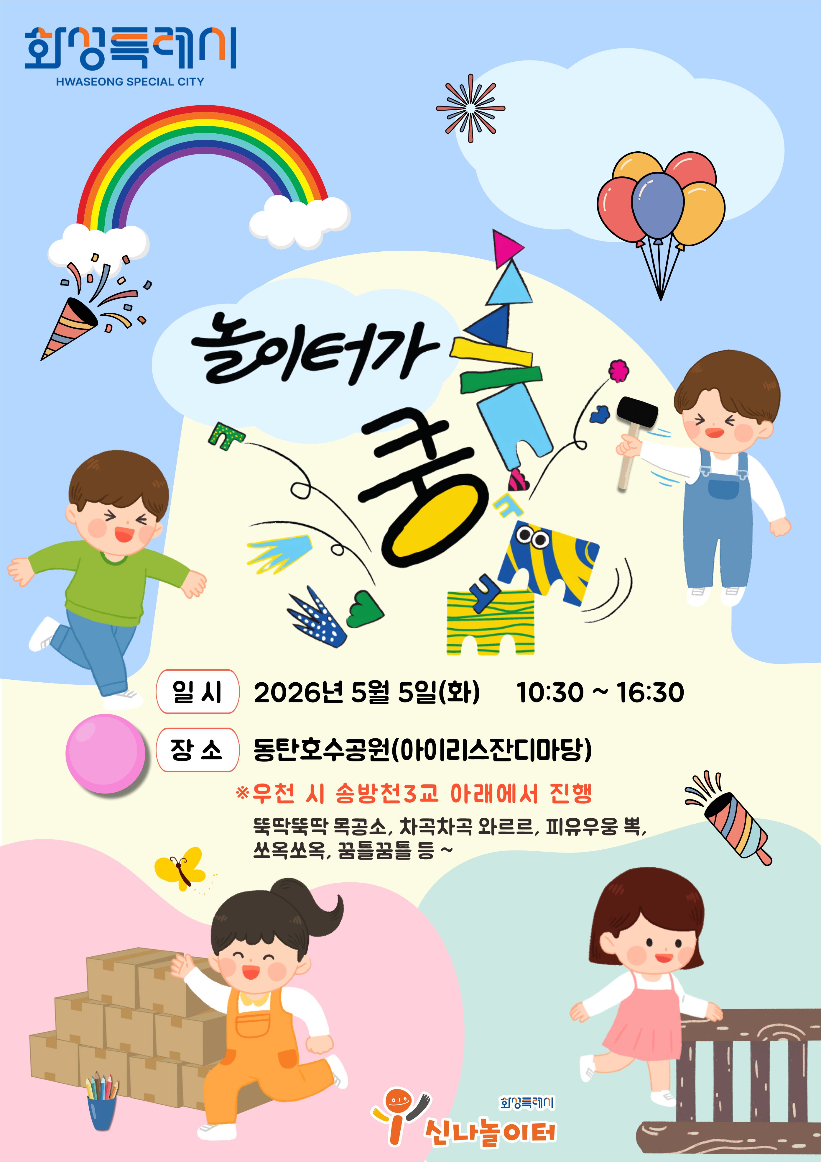 ▣ 5/5(화) 놀이터 운영은 '놀이터가 쿵' 행사로 동탄호수공원(아이리스잔디마당)에서 진행됩니다.
