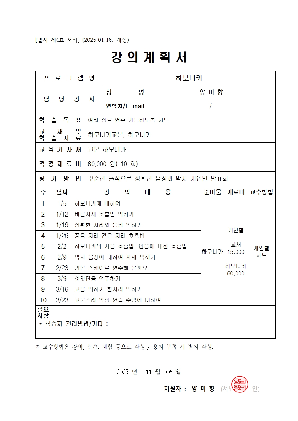 ▣ 재료비 : 하모니카 65,000원 (개인악기지참), 교재비 15,000원 상당