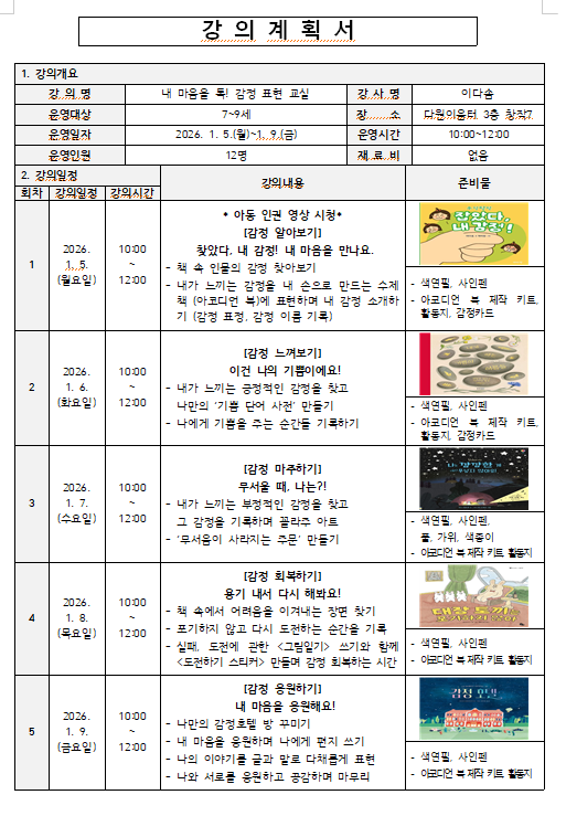 [다원이음터도서관] 2026년 다원 겨울독서교실 <내 마음을 톡! 감정 표현 교실>