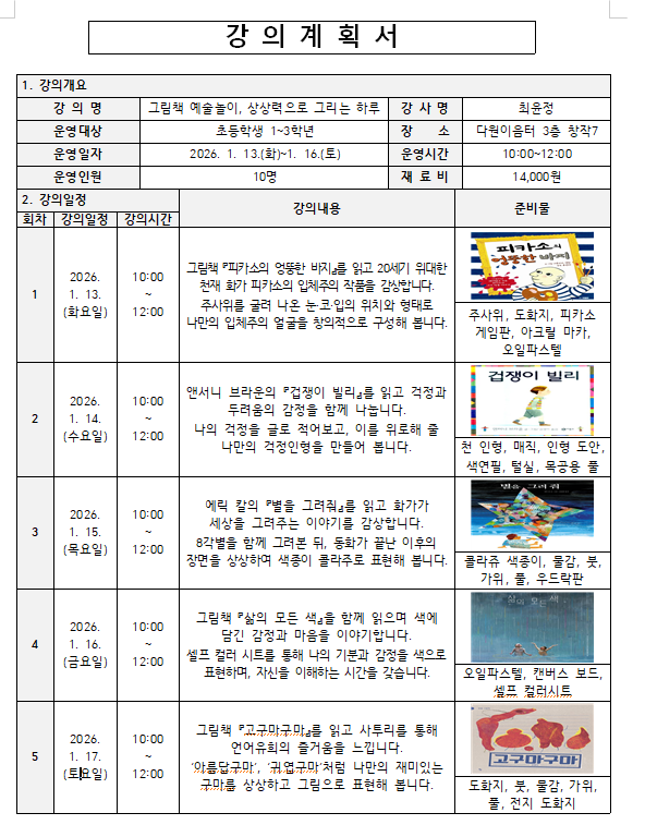 [다원이음터도서관] 2026년 다원 겨울독서교실 <그림책 예술놀이, 상상력으로 그리는 하루>