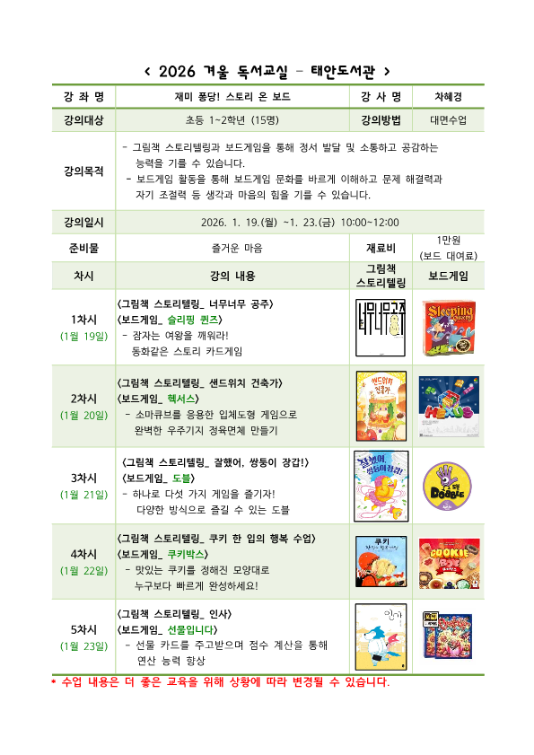 [태안도서관 겨울독서교실 <재미 퐁당! 스토리 온 보드> 운영 안내]