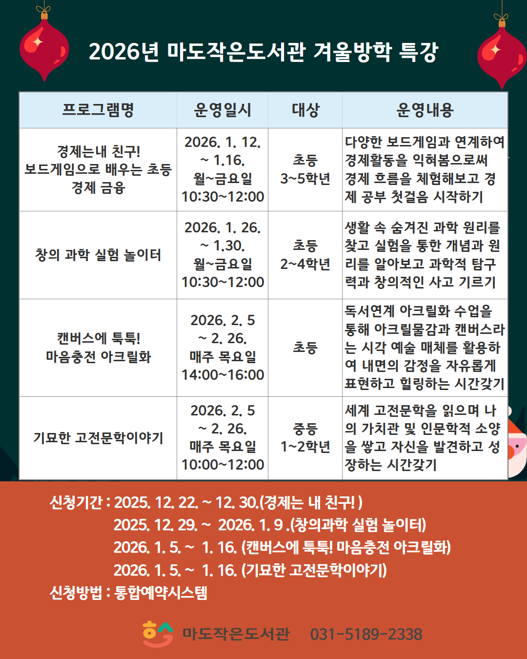 [마도작은도서관] 2026년 겨울방학 특강 안내