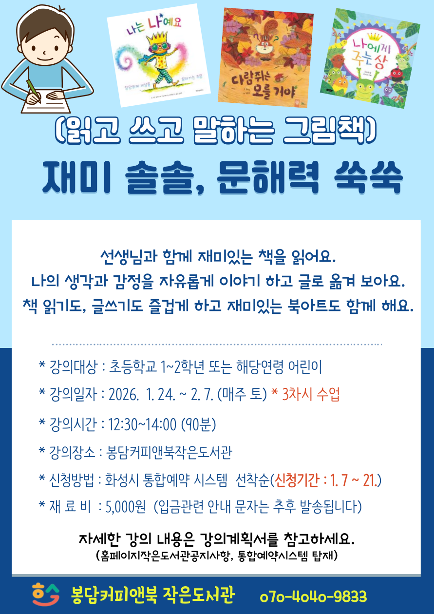 [봉담커피앤북작은도서관] 겨울방학 독서문화프로그램 <재미 솔솔, 문해력 쑥쑥> (초등1~2)