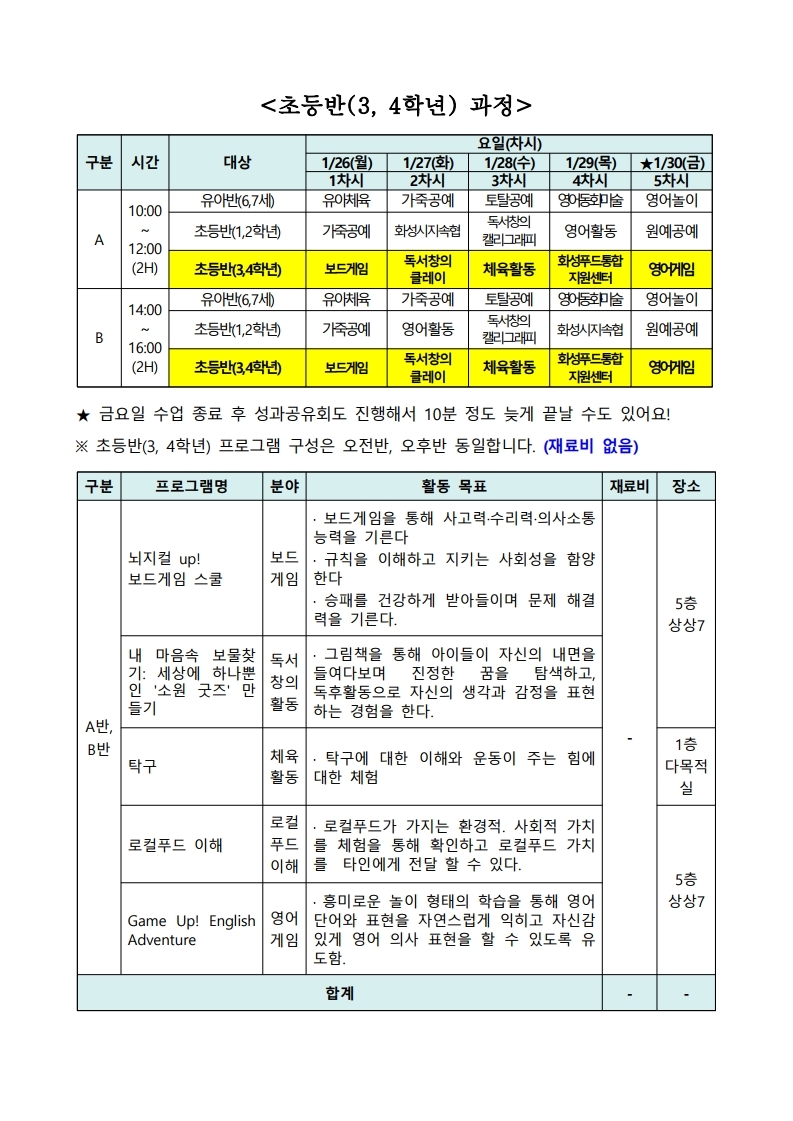 - 오후반(14:00~16:00)=B반: 36명(유아 6, 7세/초등 1, 2학년/초등 3, 4학년 각 12명씩)