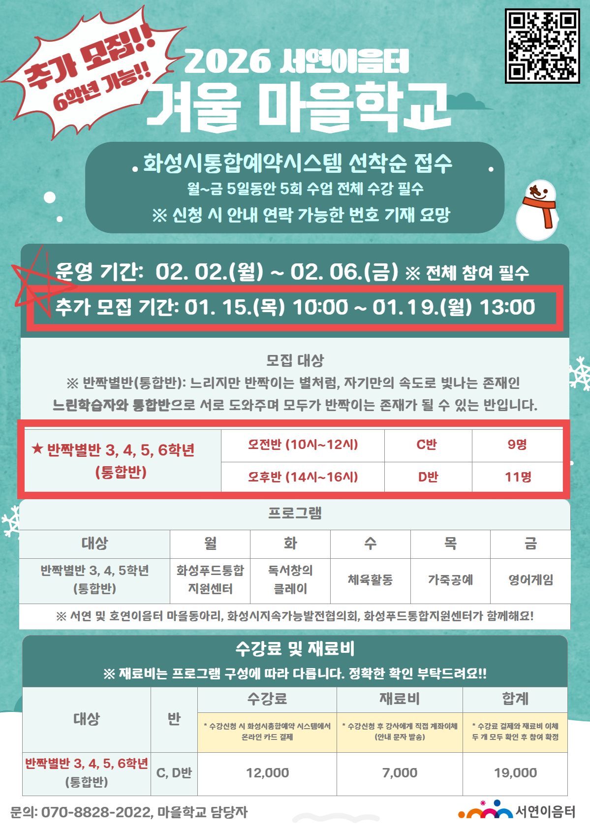 *추가모집* (C반(오전)/느린학습자 3, 4, 5, 6학년((통합반))2026 서연이음터 겨울 마을학교