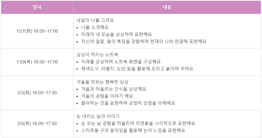 ◈ 운영 일시: 1/27(화), 1/29(목), 2/3(화), 2/5(목) 16:00~17:00
