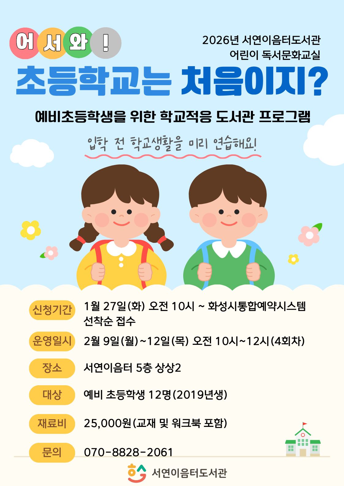 2026년 서연이음터도서관 어린이 독서문화교실 <어서와! 초등학교는 처음이지?>