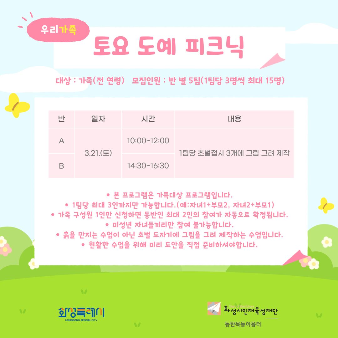 - 반 별 5가족을 모집하며, 1가족당 최대 3인까지 참여 가능합니다.